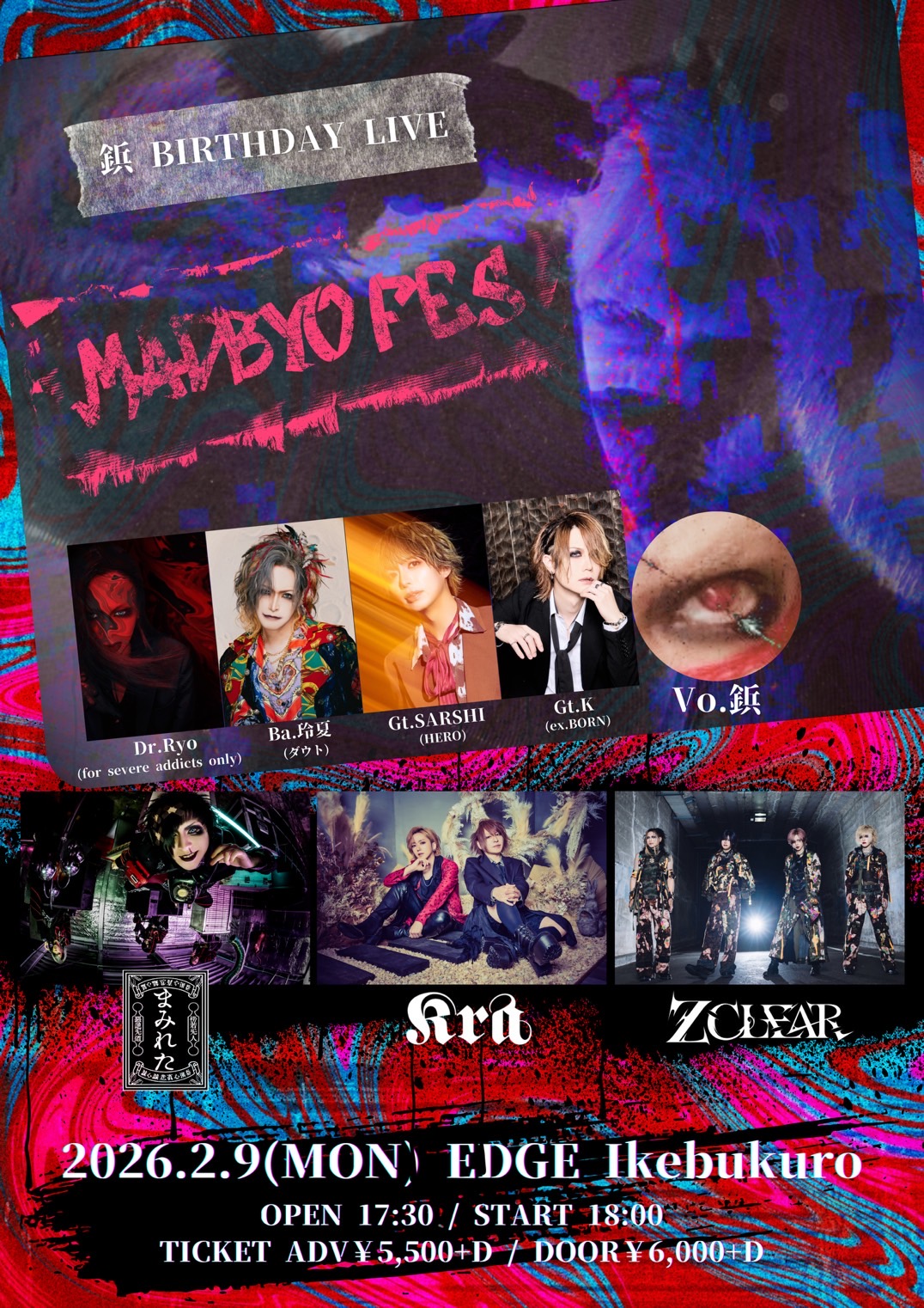 MADBYO(Vo.鋲、Gt.K、Gt.SARSHI、Ba.玲夏 、Dr.Ryo) / Kra { サポート:Gt.新井崇之(LIPHLICH)・Dr.宏崇 } / まみれた / Z CLEAR